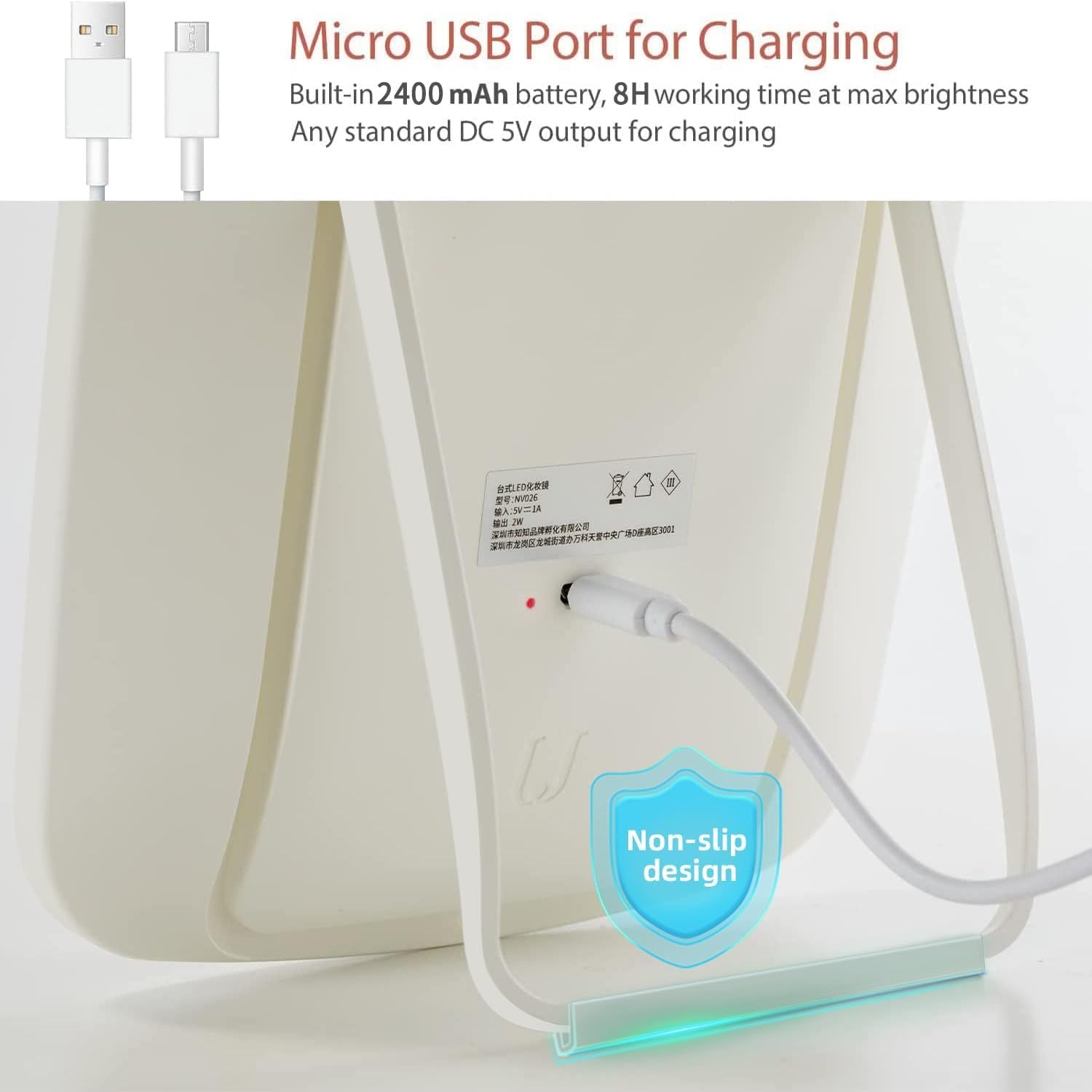 - USB Rechargeable Makeup Mirror - The desk mirror with light comes with a USB charging cable, the built-in 1500mAh battery can work for 250 minutes after fully charged.